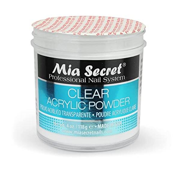 Details: Mia Secret professional acrylic clear powder, 4 oz. Acrylic powder is polymer that gives you flawless consistency and superior adhesion. It is a self-leveling polymer that requires minimum filing, a non-yellowing formula that provides clarity and strength.